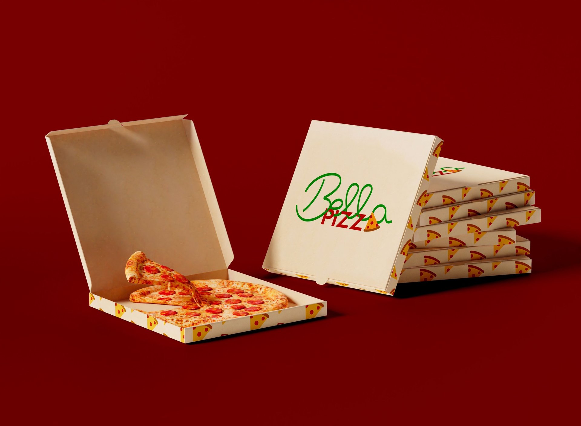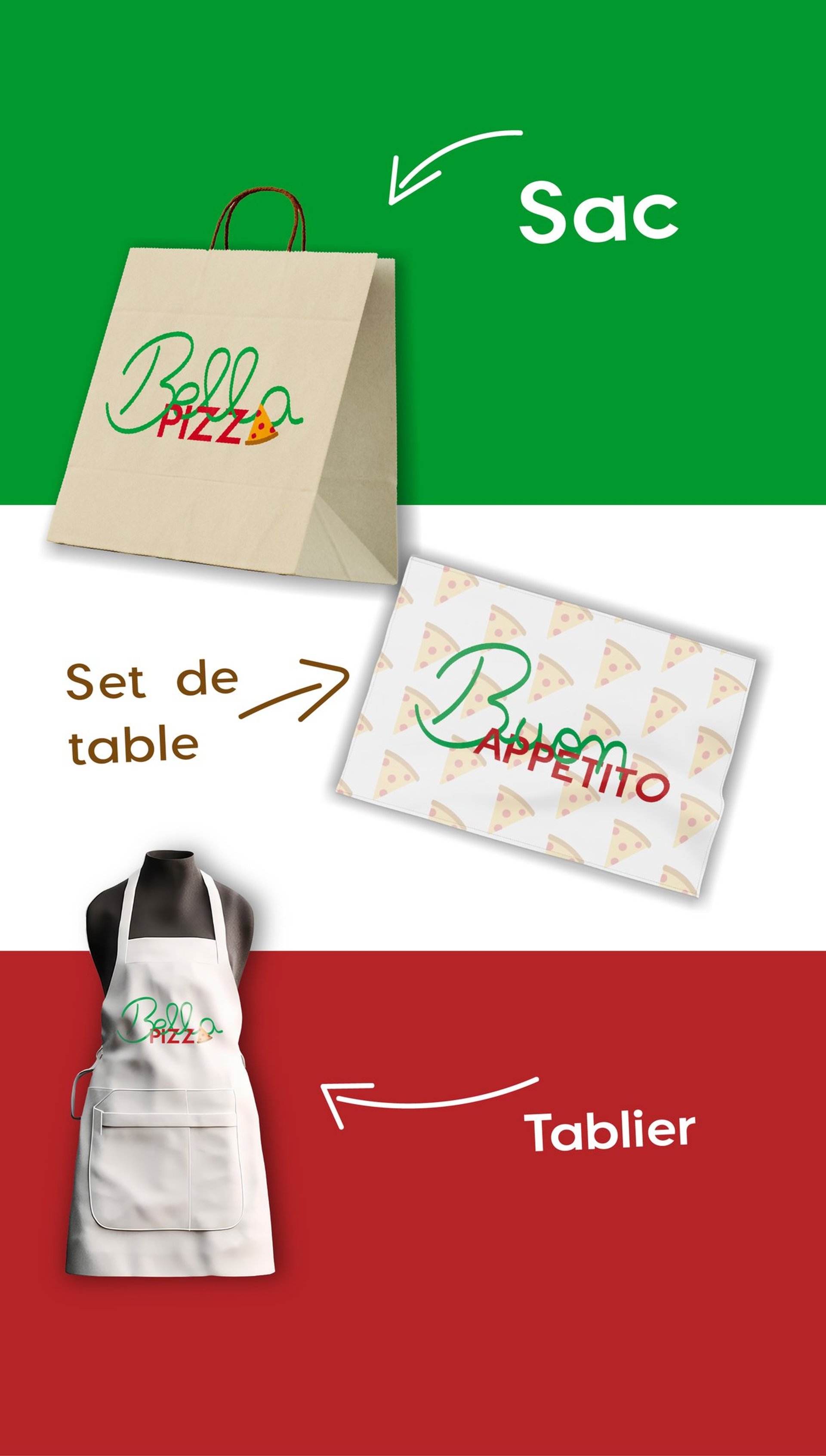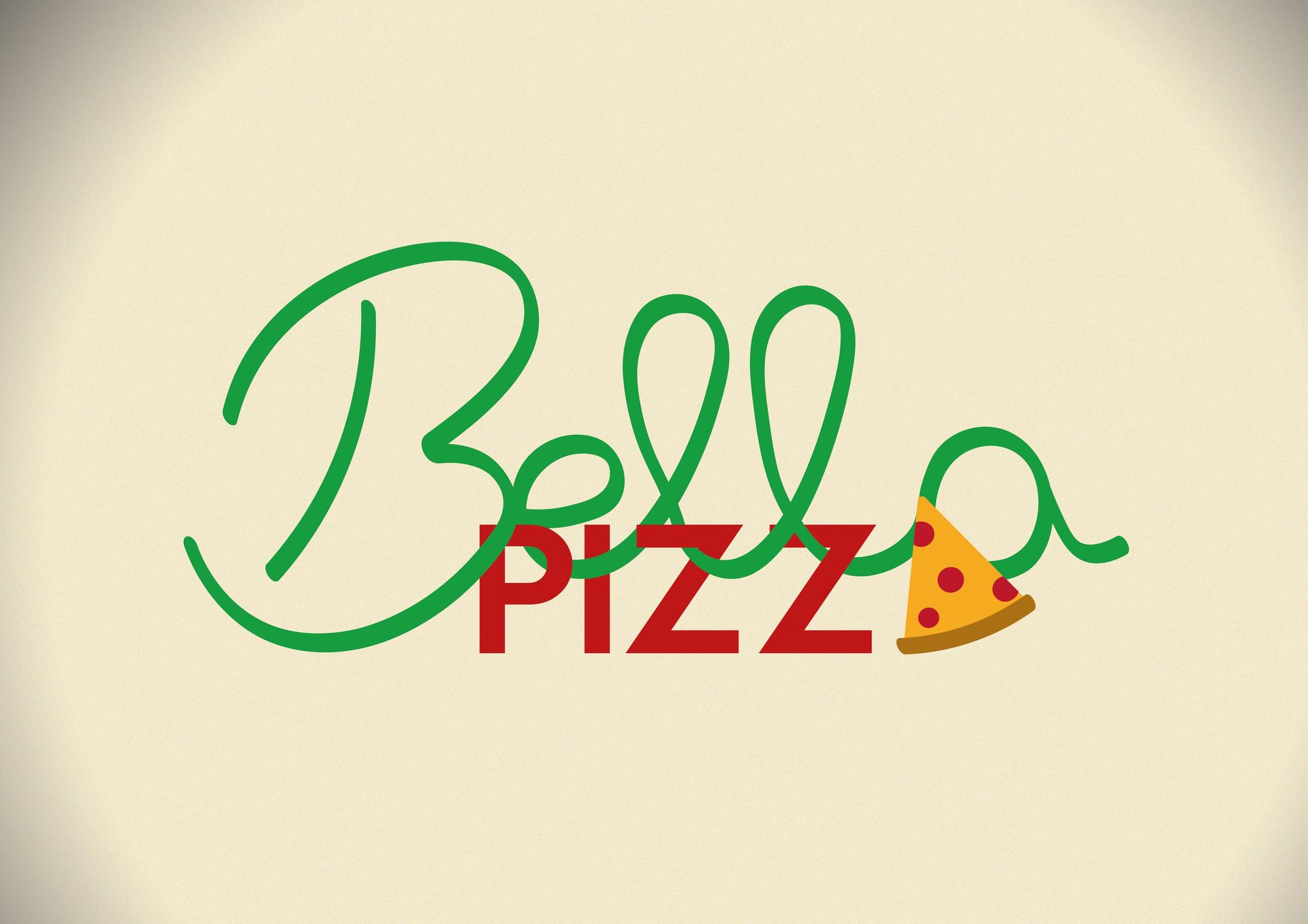 La typographie combine une écriture manuscrite pour "Bella", symbole de savoir-faire maison, et des lettres modernes pour "PIZZA", reflétant équilibre entre tradition et modernité.